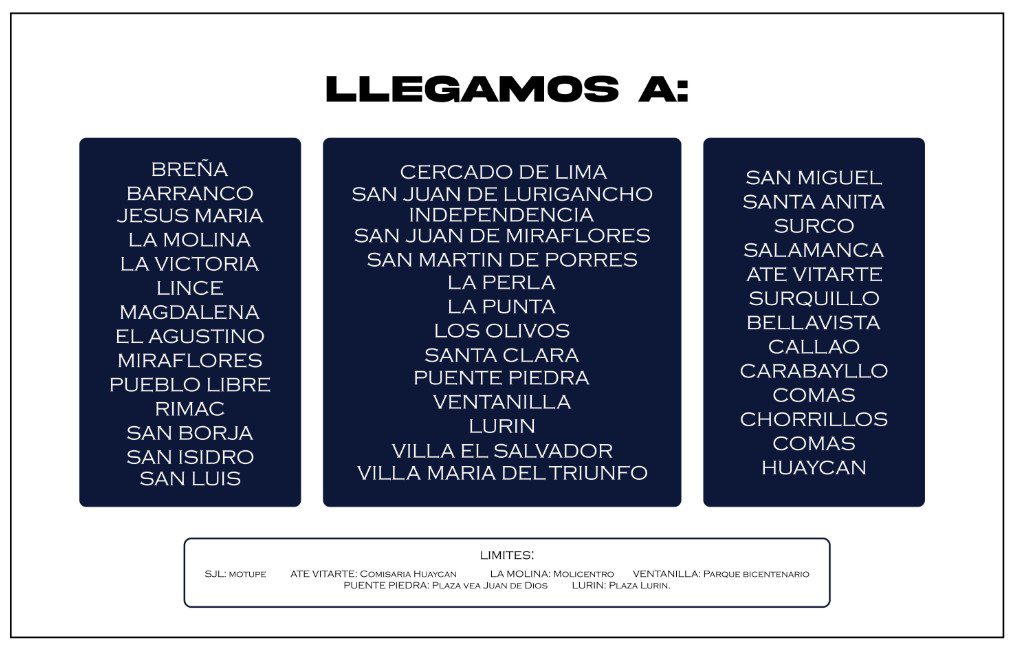 Para los distritos de Puente Piedra, Ventanilla y Carabayllo: se realizan entregas los lunes miercoles y viernes